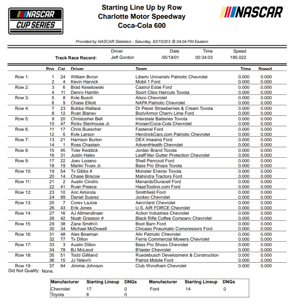 The starting lineups for tomorrow’s race are as follows:
